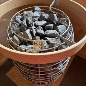 Together with the heater, it is possible to add to the cart the round olivine-based heater stones designed specifically for HUUM heaters, which are durable, have a high heat capacity and look visually beautiful, as you can see in the pictures. We recommend using such round stones in the heater because they provide milder steam. Thanks to the rounded shape of the heater stones, the water moves between the stone layers and can evaporate gradually, instead of evaporating from the top layer all at once.